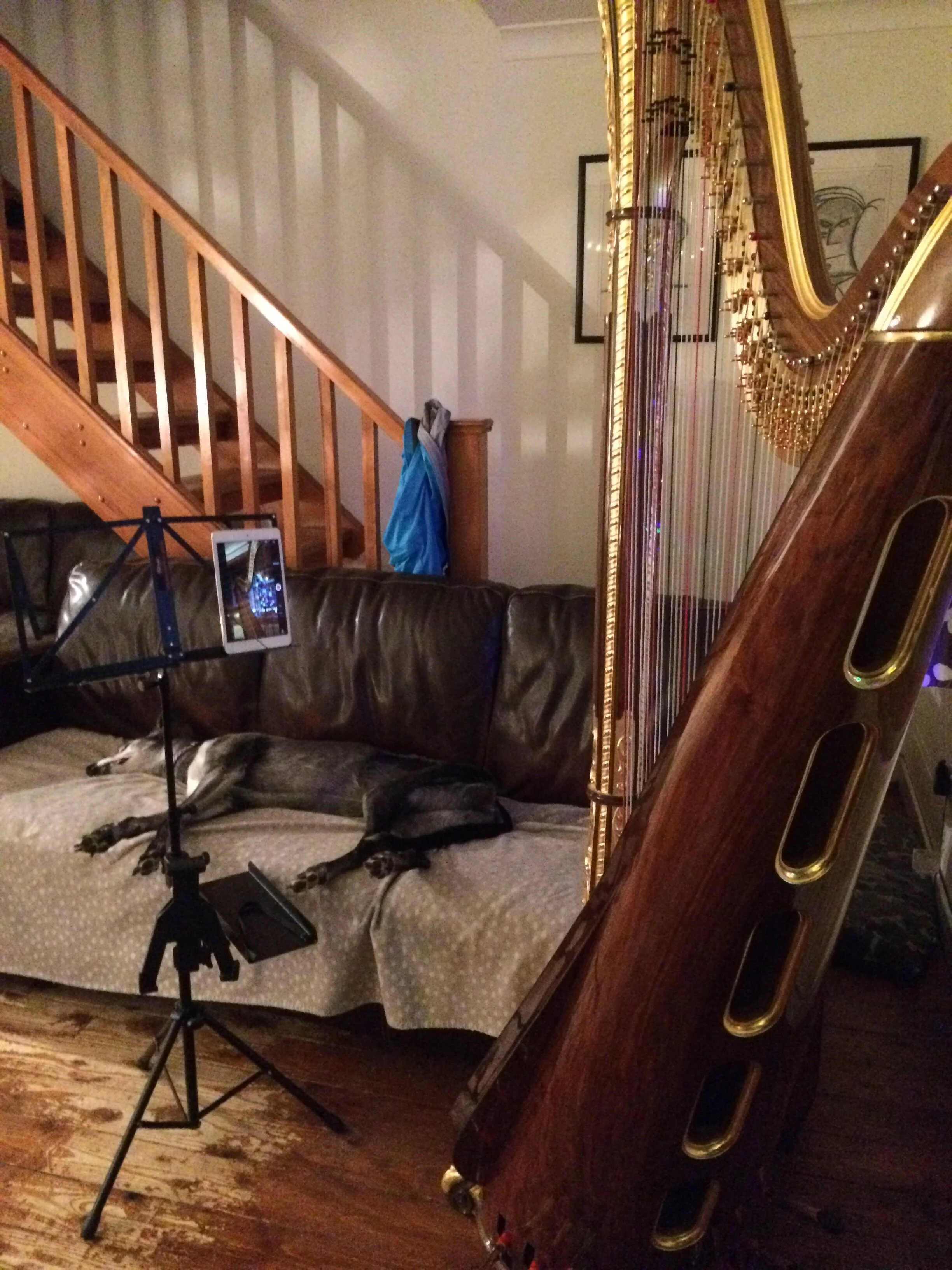 This was my view from the harp while I recorded the 2016 video! Wendy had barged Ronnie off this sofa so he must have been relegated to the smaller one.